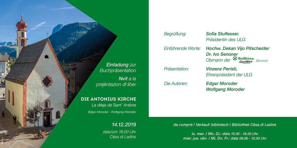 Prejentazion dl liber dla dlieja de S. AntoneSofia Stuflesser22 nov 2019Tempo di lettura: 1 minAggiornamento: 27 lug 2020Liber de Edgar Moroder cun fotografies de Wolfgang MoroderAi 14.12.2019 dala 18.00